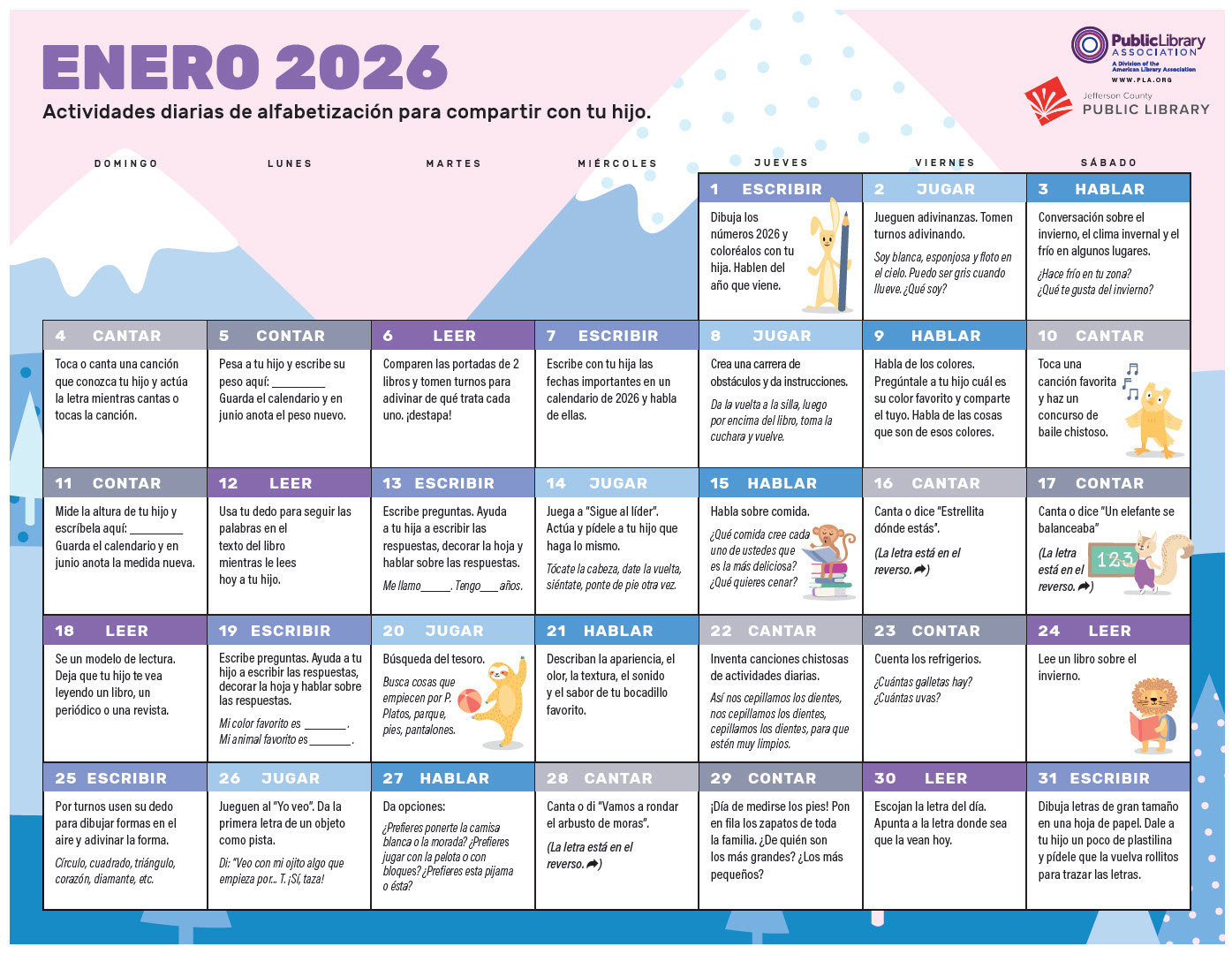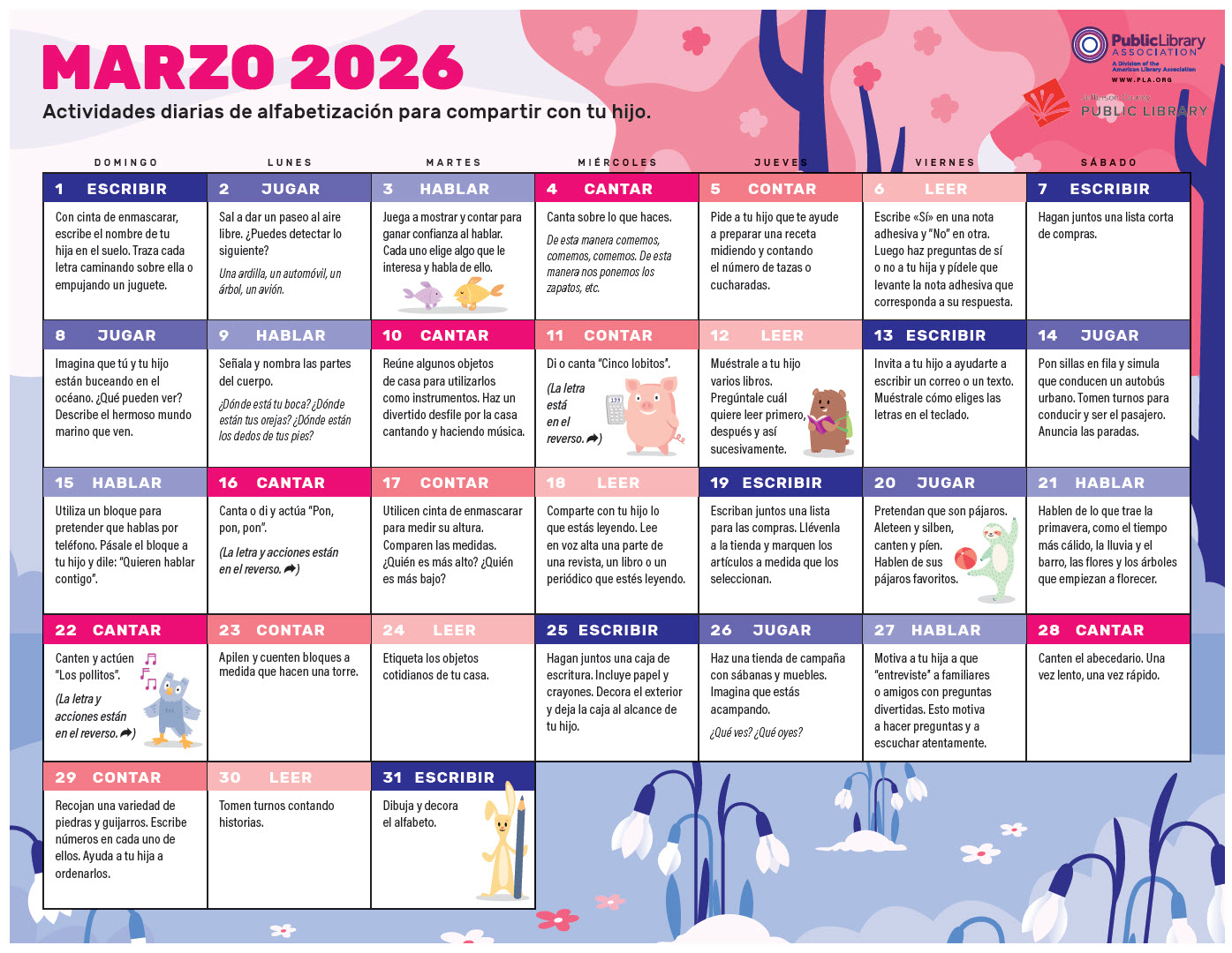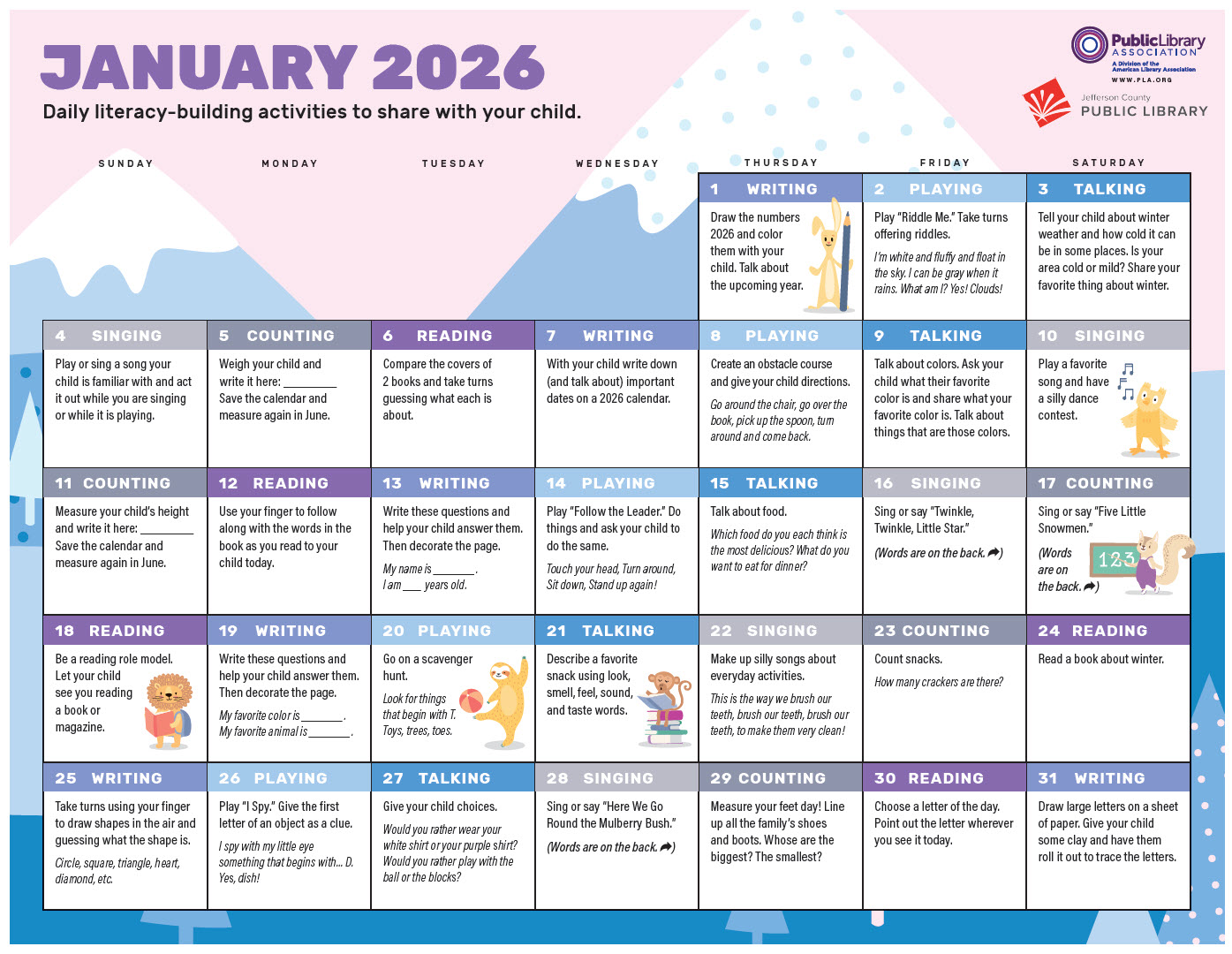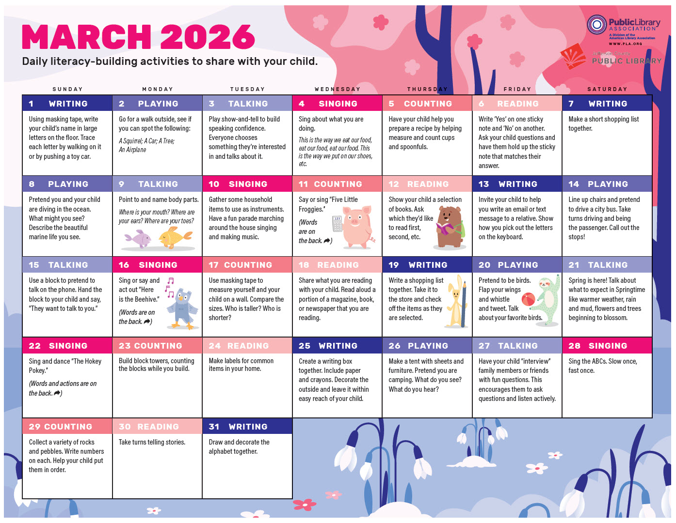 Read, write, sing, talk, play and count! Download our monthly calendar, featuring daily literacy-building activities to share with your little one.