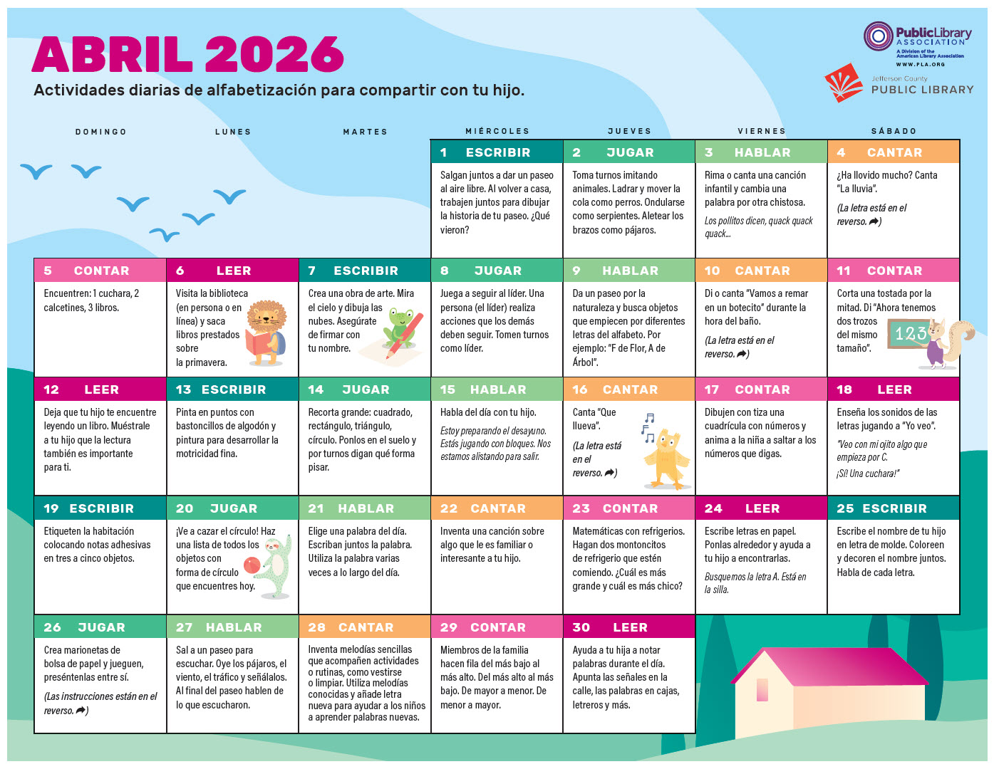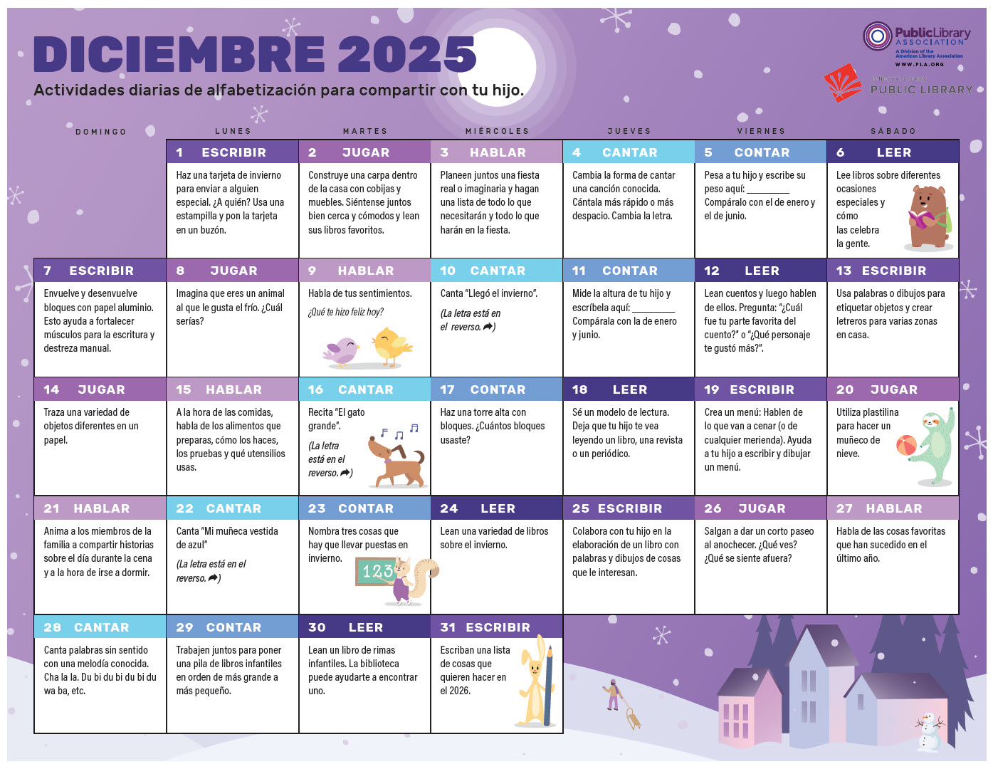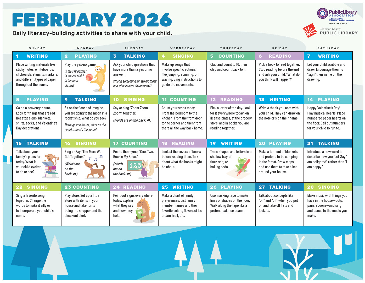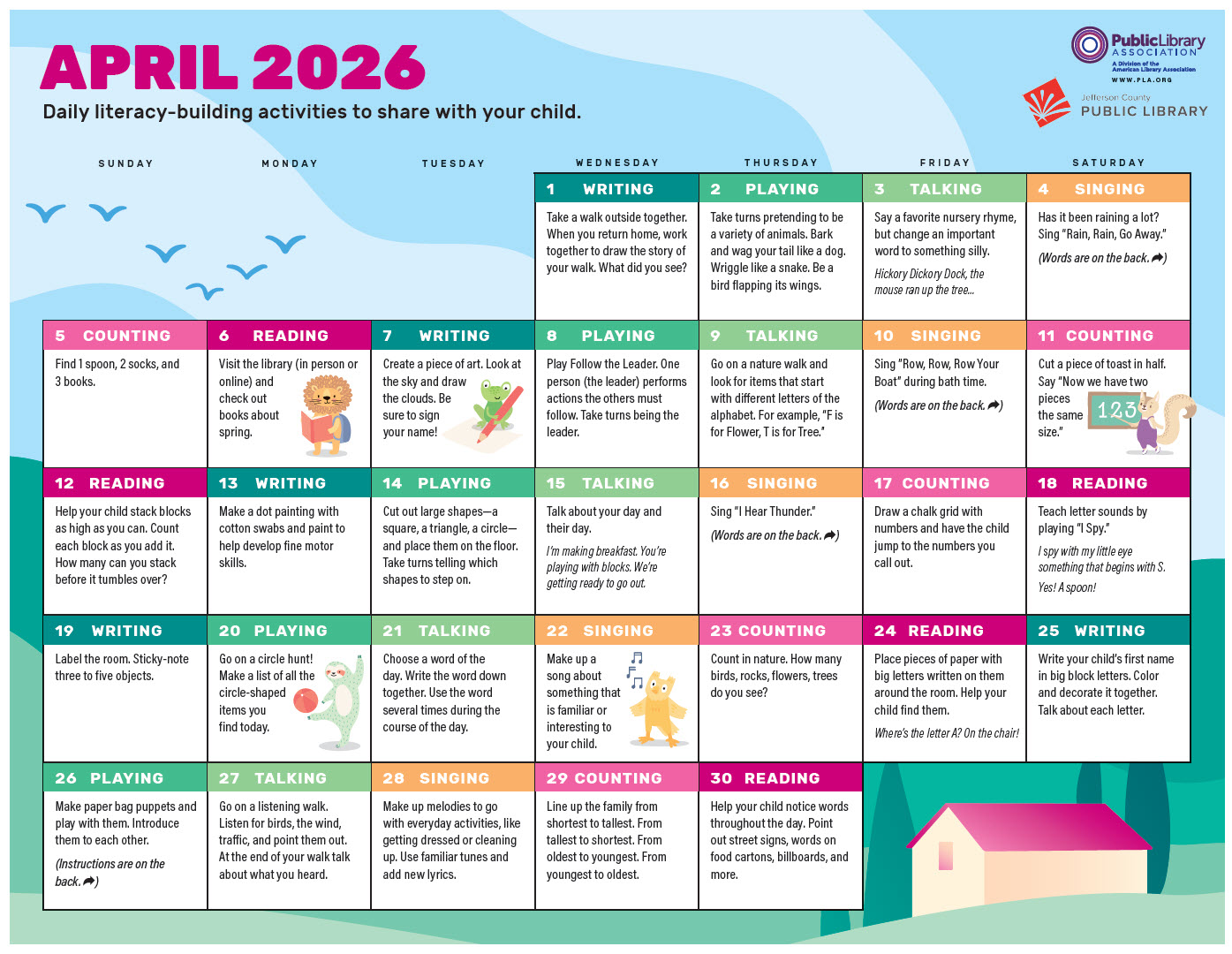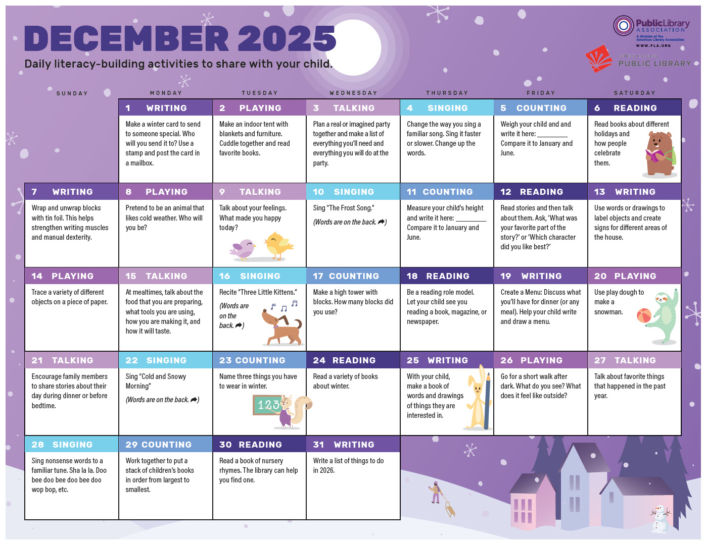 Read, write, sing, talk, play and count! Download our monthly calendar, featuring daily literacy-building activities to share with your little one.